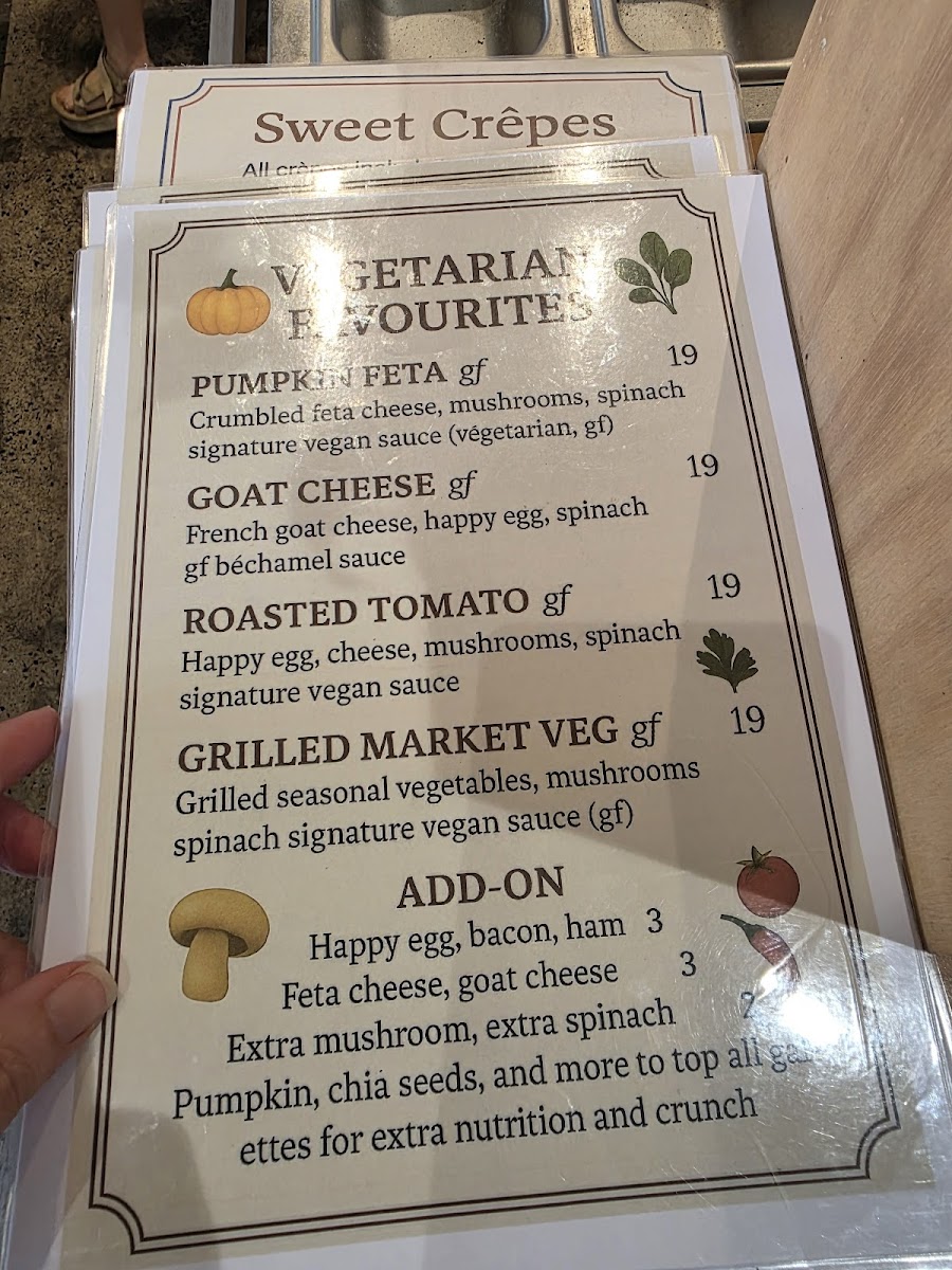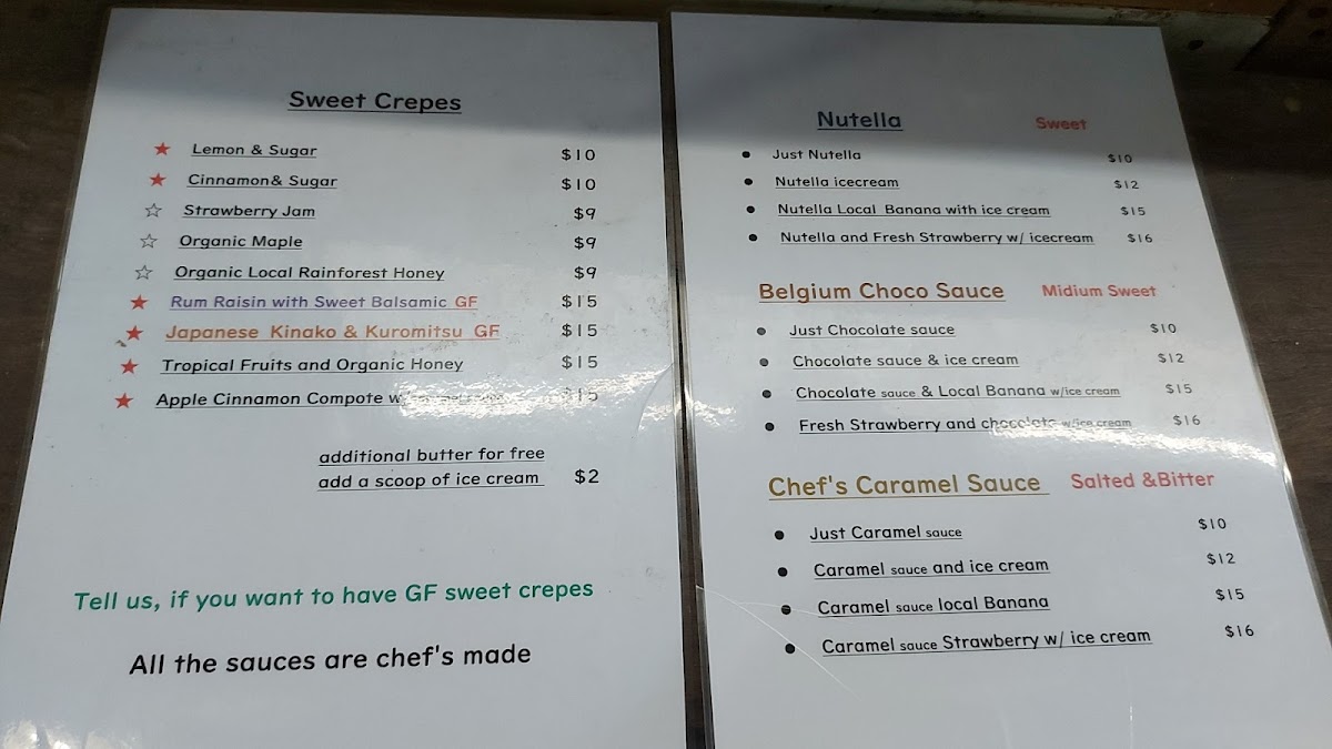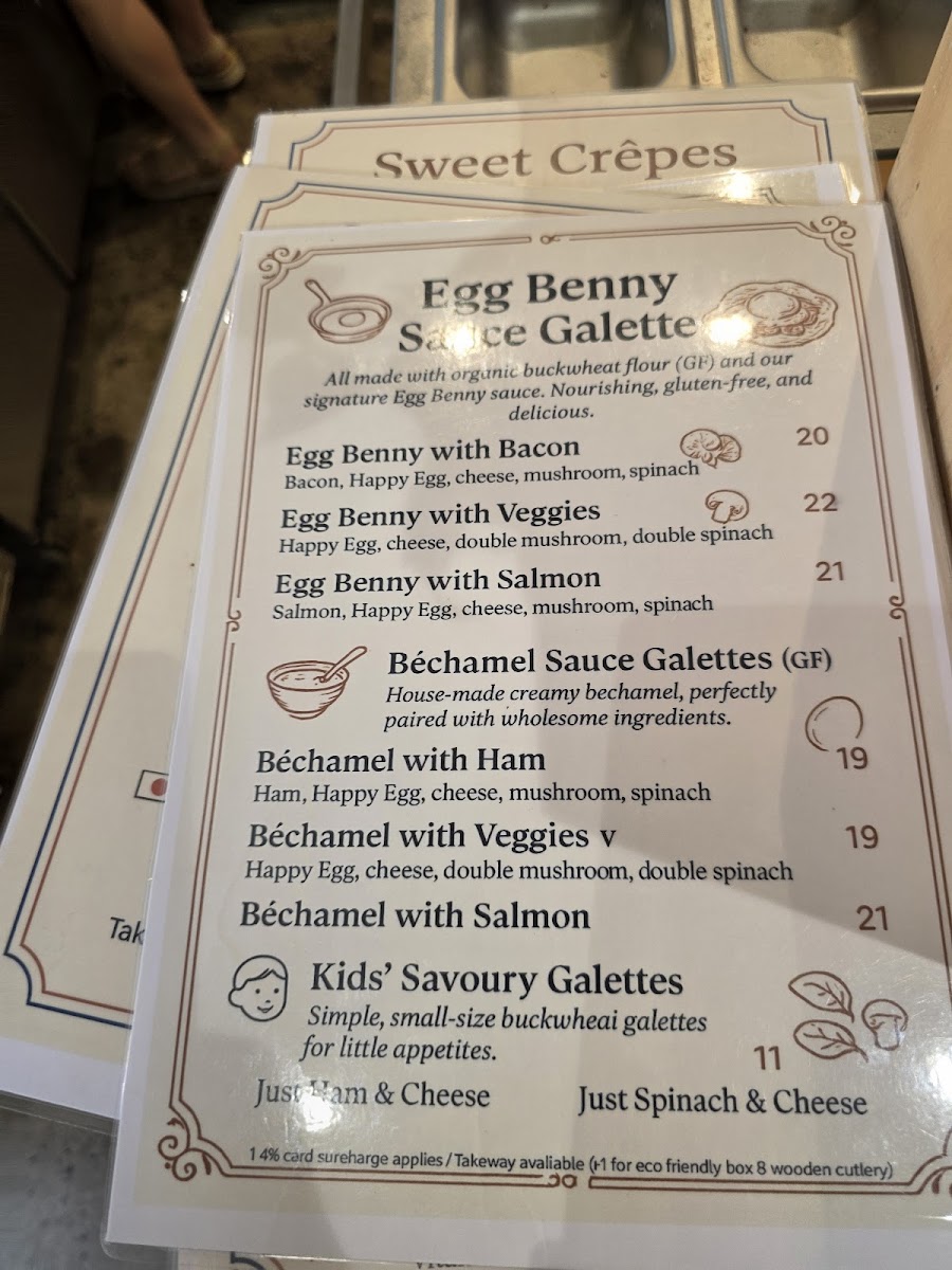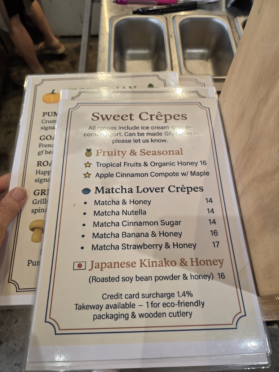 From the moment you glance at the menu at La Creperie on Spence Street, the focus is on delectably simple yet satisfying choices, with an array of both sweet and savoury options that cater to classic crepe lovers and those after a bit more flair. For dessert‑style crepes, the likes of Matcha Banana, Lemon & Sugar, Strawberry Jam with Organic Maple, Organic Local Rainforest Honey, and Nutella Icecream showcase familiar flavours elevated with quality ingredients, while variations such as Nutella with Fresh Strawberry and Ice Cream and Chocolate Sauce & Local Banana with Ice Cream add another layer of indulgence. Fans of more refined tastes will appreciate the savoury selections such as Tasmanian Brie, Goat Cheese & Pumpkin Fetta, and Bechamel Mushroom, offering a rich contrast to the sweeter offerings. Complementing the crepes are simple extras and beverages like Matcha Latte and French Earl Grey, as well as hearty sides such as Ham & Cheese or Bacon BBQ, making the menu feel both comforting and complete.